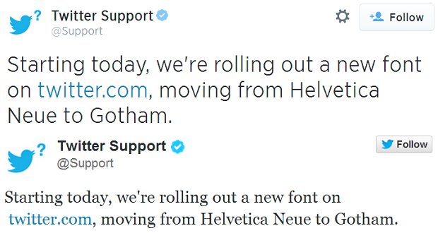 像 Twitter 這類知名的社交網站,要換字體真的需要極大的勇氣,特別當要被換掉的字體是全世界最流通的 Helvetica(Neue)字體之時,不過 Twitter 依然勇往直前!由現在開始,只要大家打開 Twitter 的話,都會發現字體已由 Helvetica Neue(圖下)換成 Gotham(圖上 ),整體感覺好像活潑一點,沒有那麼嚴肅。不過網上已有很多人指出他們不喜歡 Twitter 採用這種新字體,大家又怎樣看呢?相對 Google 最近將標誌中的 g 和 l 字移動了一丁點,Twitter 之舉確是驚人很多。